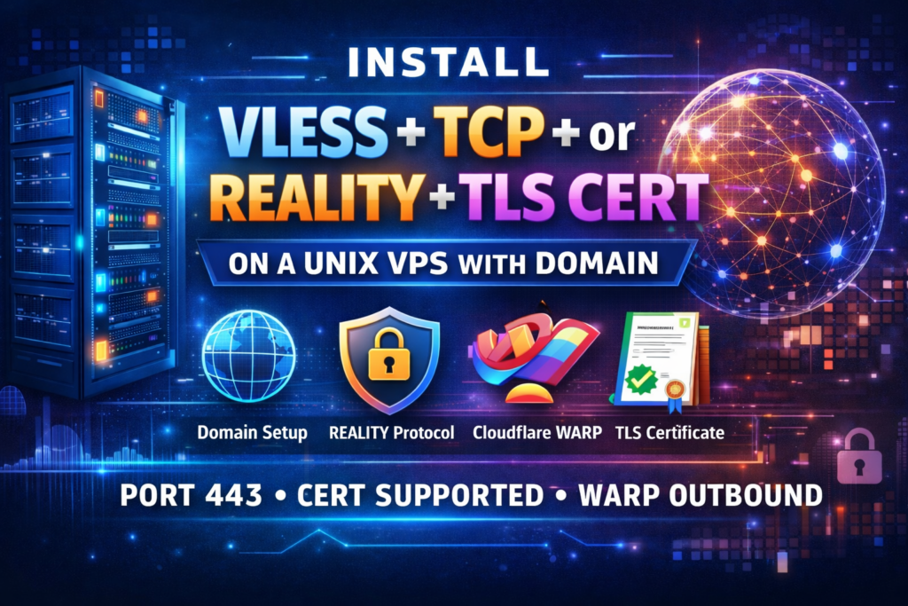 This tutorial shows how to install VLESS with TCP + REALITY and Cloudflare WARP on a Unix-based VPS using a domain name linked via an A record. The setup runs on port 443, requires no TLS certificates, and provides strong traffic camouflage with high compatibility. Using WARP as outbound improves privacy and stability, making this solution ideal for a fast and secure VLESS server deployment.